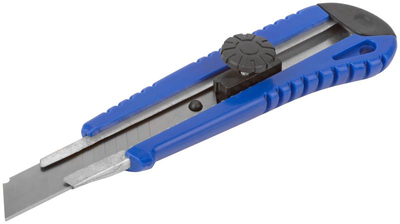 Применяется для резки бумаги, обоев,скотча, картона средней твердости.Рифленая форма ножа обеспечивает крепкий захват и предотвращает выскальзывание при использовании. Компактный корпус изготовлен из пластика, сегментированное лезвие из высокоуглеродистой инструментальной стали состоит из 15 сегментов,гарантирует стабильность во время работы.Нож имеет металлические направляющие и фиксатор лезвия.