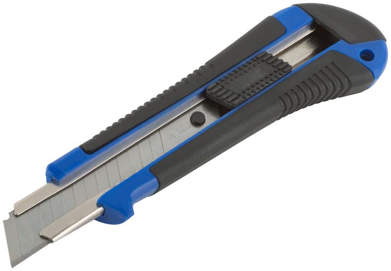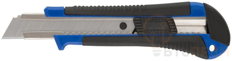 Применяется для резки бумаги, обоев,скотча, картона средней твердости.Рифленая форма ножа обеспечивает крепкий захват и предотвращает выскальзывание при использовании. Компактный корпус изготовлен из пластика, сегментированное лезвие из высокоуглеродистой инструментальной стали состоит из 15 сегментов,гарантирует устойчивость во время работы.Нож имеет металлические направляющие и автофиксатор лезвия.