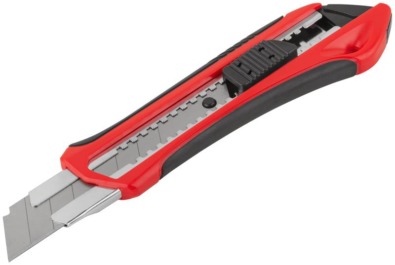 «Рубин». Сегментированное лезвие из высокоуглеродистой инструментальной стали. Металлическая направляющая с двусторонней автофиксацией для усиления конструкции. Прорезиненный корпус из ударопрочного ABS пластика. Упаковка: блистер.