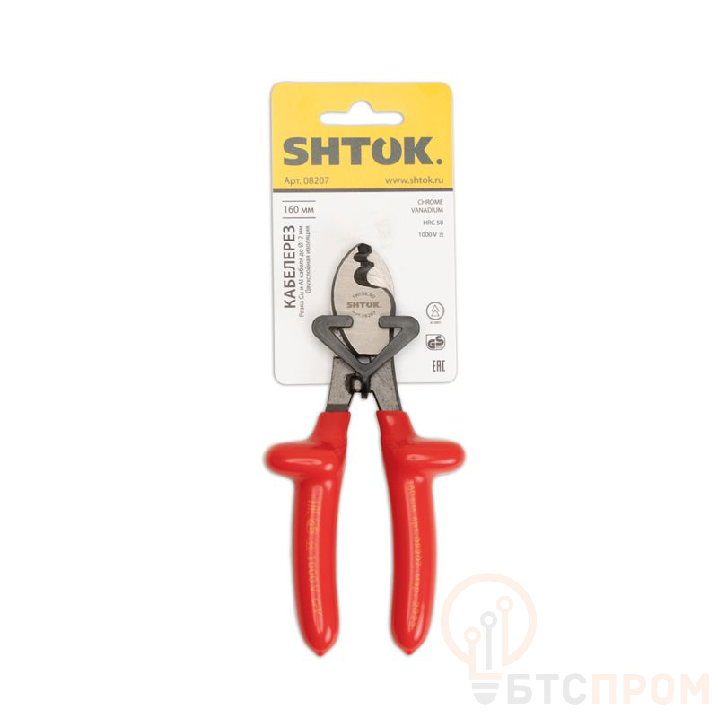 Кабелерез диэлектрический SHTOK (08207) — профессиональный инструмент для безопасной резки кабелей и проводов под напряжением до 1000В. Имеет изолированные рукоятки, соответствующие классу защиты 1000В, что обеспечивает надежную защиту оператора при работе в электроустановках.