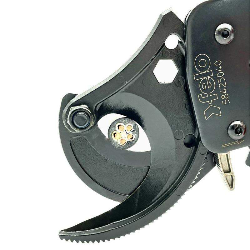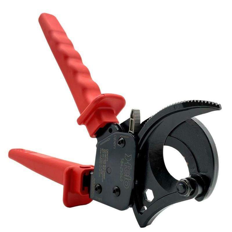 Кабелерез секторный FELO 58425040 предназначен для простой и удобной резки кабелей. Он оснащен надежным храповым механизмом, позволяющим прикладывать минимальные усилия для резки толстых медных, алюминиевых одножильных и многожильных кабелей. Для более безопасного хранения и транспортировки на инструменте предусмотрен блокиратор рукояток, который предотвращает случайное смыкание режущих кромок. Разблокировка лезвий секторного кабелереза осуществляется из любого положения. На инструменте имеется трещоточный механизм, который позволяет прикладывать меньше сил для резки толстого кабеля. Имеются упоры для пальцев. Рукоятки с пластиковыми предотвращают соскальзывания руки пользователя во время работы. Благодаря компактности и незначительному весу можно работать инструментом в ограниченном пространстве. Изделие выполнено из специальной инструментальной легированной стали, что увеличивает его прочность, а значит и срок службы. Поверхность покрыта черным лаком, предотвращающим коррозию. Во избежание выхода инструмента из строя, не рекомендуется использовать для резки стальной проволоки и проволочных тросов. Диапазон сечений кабелей для резки: алюминиевый кабель – до 380 мм2, медный кабель – до 300 мм2.