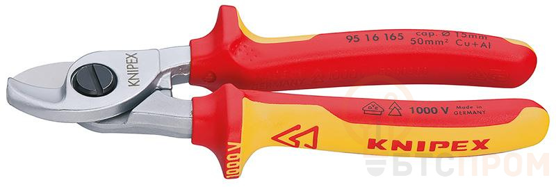 Кабелерез VDE 1000В рез: кабель d 15мм (50кв.мм AWG 1/0) L165мм диэлектрические хром. двухкомпонентн. рукоятки Knipex KN-9516165