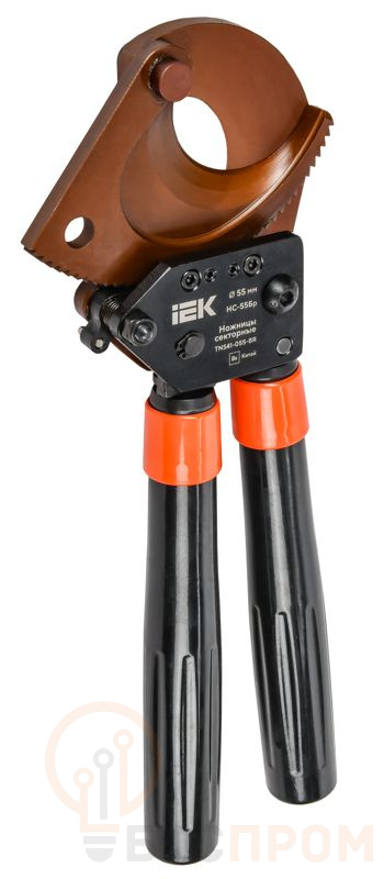 Основные характеристики: длина 255 мм, режущая способность — алюминиевые жилы до 55 мм² и медные до 35 мм². Предусмотрен храповый механизм для плавного разрезания жестких проводников. Специальный секторный профиль лезвий предотвращает выскальзывание кабеля.