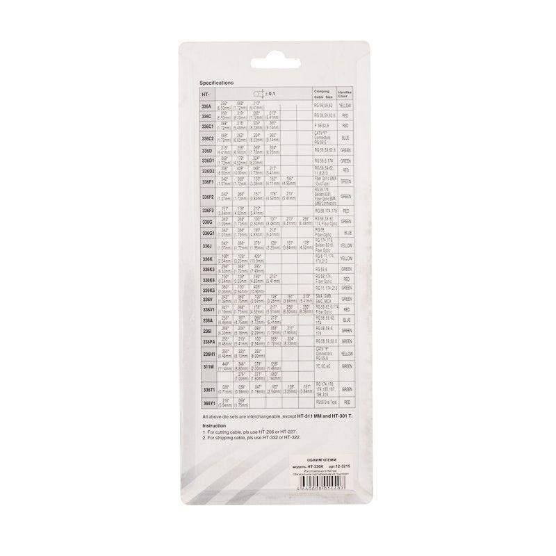Кримпер HT-301K предназначен для обжима коаксиальных разъемов F и BNC типа RG-8, RG-11, RG-174, RG-179, RG-213. Корпус кримпера изготовлен из высокопрочной закаленной инструментальной стали с воронением, благодаря чему устойчив к механическим воздействиям и имеет продолжительный срок службы. Съемные обжимные губки изготовлены микролитьем и гарантируют точное соответствие размеру и форме клемм и контактов. Специальный регулятор позволяет контролировать прижимное усилие матриц, а храповой механизм производит полный цикл качественной опрессовки. Также инструмент оснащен передаточным механизмом, который уменьшает нагрузку на руку при сведении рукояток, и возвратным механизмом, который обеспечивает обратный ход рукояток и упрощает процесс работы с инструментом. Однокомпонентные защитные рукоятки выполнены из плотного нескользящего резинового материала, который делает работу с инструментом легкой и приятной.