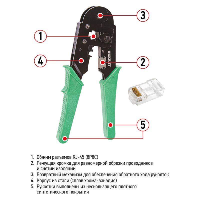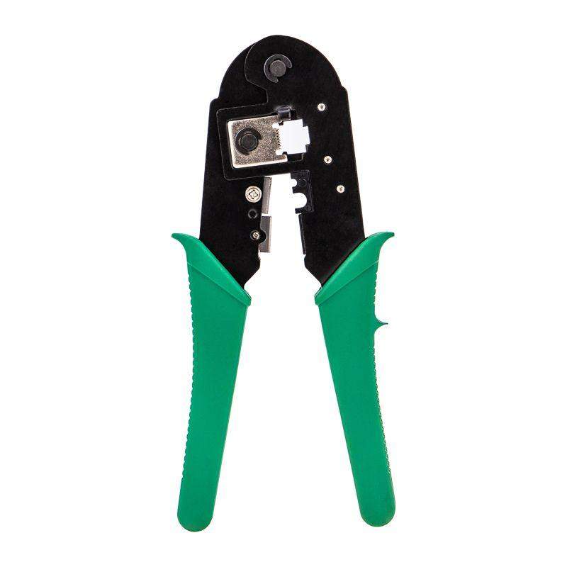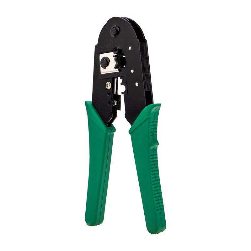 Кримпер HT-210T предназначен для обжима компьютерных и телефонных разъемов RJ-45. Корпус кримпера изготовлен из высокопрочной хром-ванадиевой стали с воронением, благодаря чему устойчив к механическим воздействиям и имеет продолжительный срок службы. Обладает дополнительными функциями обрезки проводов и снятия изоляции с плоских и круглых кабелей. Оснащен возвратным механизмом, который обеспечивает обратный ход рукояток и упрощает процесс работы с инструментом. Однокомпонентные защитные рукоятки выполнены из плотного нескользящего синтетического материала, который делает работу с инструментом легкой и приятной.