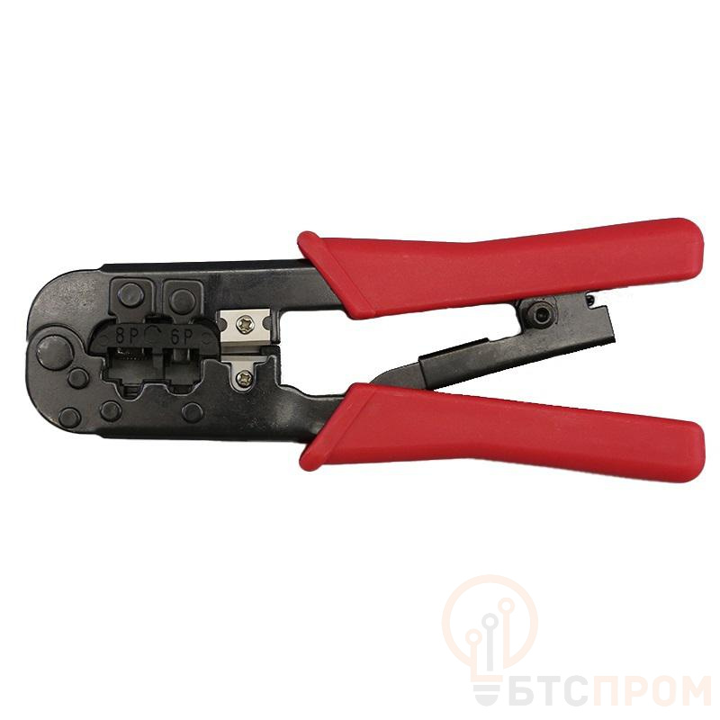 Кримпер SUPRLAN SYSTEM - может быть использован для работы как с 8-позиционными, так и с 6-позиционными модульными вилками RJ-45 (8P8C) и RJ-11 (6P4C). В конструкции инструмента предусмотрен резак, используемый для выравнивания концов проводов по длине перед вводом в гнездо вилки, а также снятия оболочки. Заданное усилие давления на контакты и фиксирующий зажим кабельной оболочки обеспечивается применением храпового механизма.