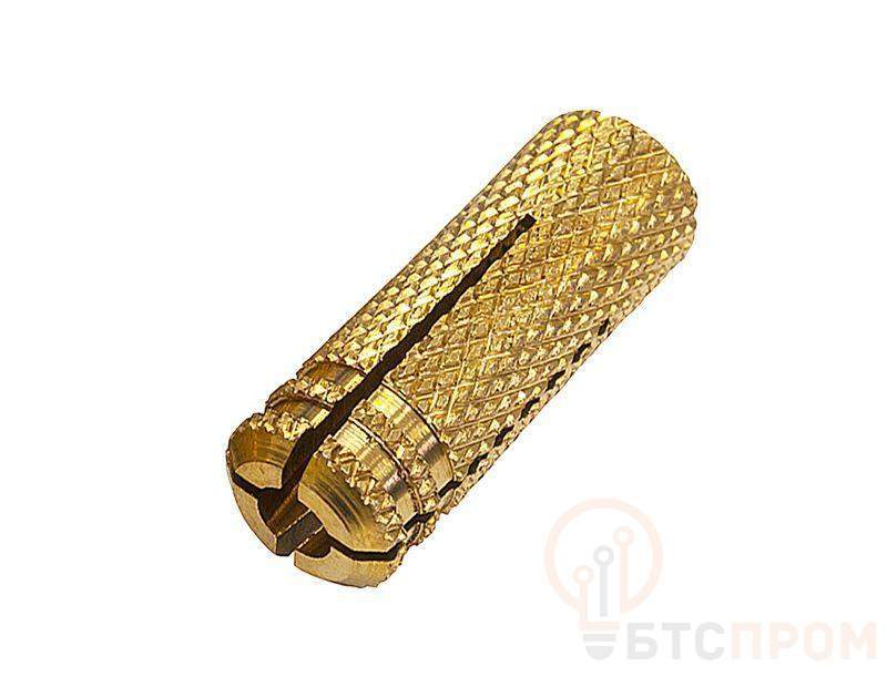 Анкер забиваемый латунный М8 применяется для монтажа различных конструкций в полнотелые кирпич, бетон, природный камень. С анкером необходимо использовать резьбовые изделия (болты, шпильки, винты) диаметром М8 Анкер латунный М8 изготовлен из латуни и имеет высокую устойчивость к коррозии. Часто применяется при работах во влажных условиях (напимер, монтаже закапываемых инженерных систем). Латунная цанга М8 имеет диаметр 10 мм и длину 30 мм (внешние размеры). Для отверстия применяется бур диаметром 10. Глубина отверстия должна быть не менее 30. Забиваемый анкер латунный предназначен для нагрузок (для бетона B25) на вырыв до 1,5 кН и на срез до 1,5 кН.
