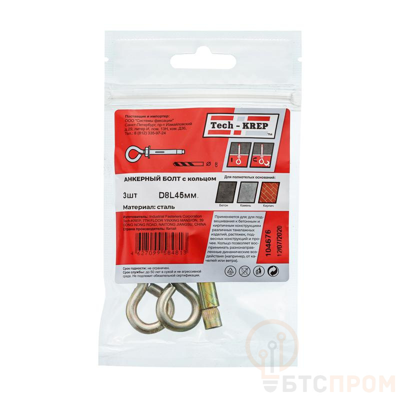 Болт анкерный 8х45 с кольцом (уп.3шт) пакет Tech-Krep 104676 фото в каталоге от BTSprom.by