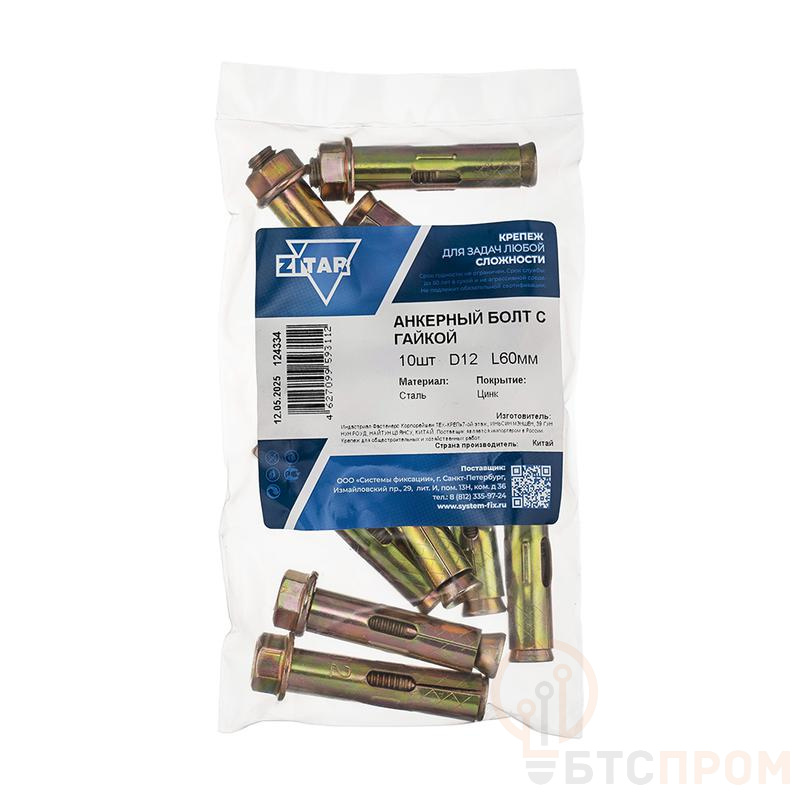 Болт анкерный с гайкой 12х60 от бренда Tech-Krep/Zitar — это надежный и долговечный крепежный элемент, предназначенный для фиксации тяжеловесных конструкций в полнотелых и твердых материалах. Изделие состоит из стальной оцинкованной шпильки с резьбой, конусного распорного элемента и шестигранной гайки.