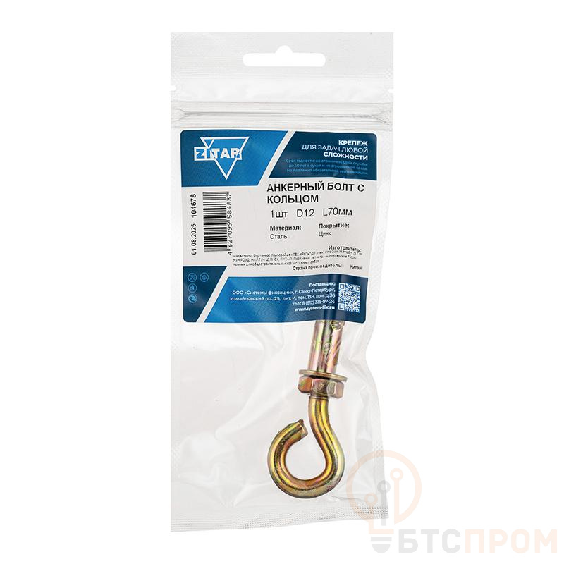Болт анкерный с кольцом 12х70 от бренда Tech-Krep/Zitar (арт. 104678) — это надежный и долговечный крепежный элемент, предназначенный для монтажа тяжеловесных конструкций в полнотелые и плотные основания. Изделие состоит из стальной оцинкованной гильзы, конусного распорного клина и стального кольца, что обеспечивает максимальную прочность и устойчивость к коррозии.