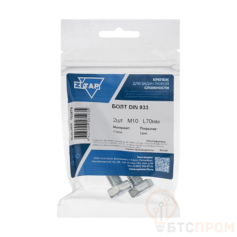 Болт DIN933 с шестигранной головкой М10х70 оцинк. (уп.2шт) Tech-KREP 102979 фото в каталоге от BTSprom.by