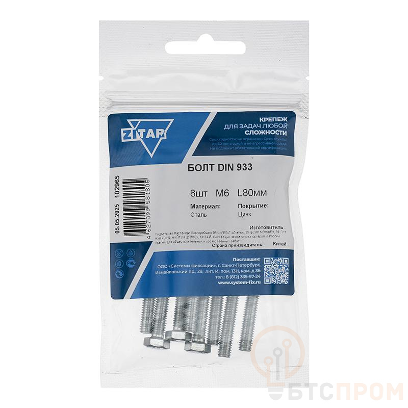 Болт с шестигранной головкой М6х80 DIN 933 оцинк. (уп.8шт) Tech-Krep/Zitar 102965 фото в каталоге от BTSprom.by