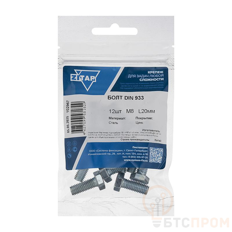 Болт с шестигранной головкой М8х20 DIN 933 оцинк. (уп.12шт) Tech-Krep/Zitar 102967 фото в каталоге от BTSprom.by