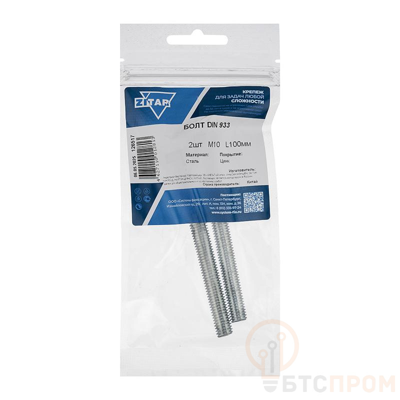 Болт с шестигранной головкой М10х100 DIN 933 оцинк. (уп.2шт) Tech-Krep/Zitar 126517 фото в каталоге от BTSprom.by