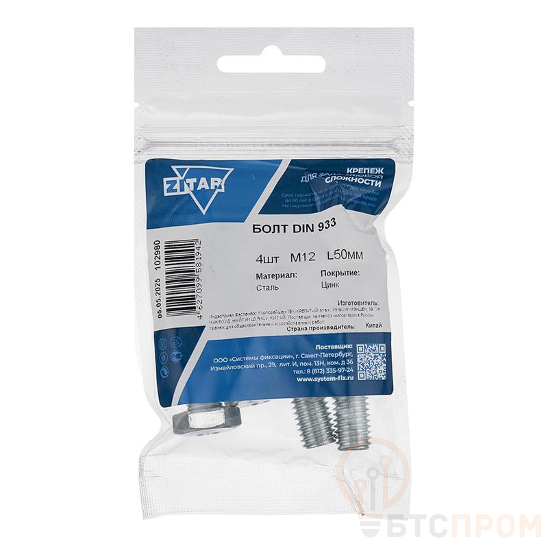 Болт с шестигранной головкой М12х50 DIN 933 оцинк. (уп.4шт) Tech-Krep/Zitar 102980 фото в каталоге от BTSprom.by