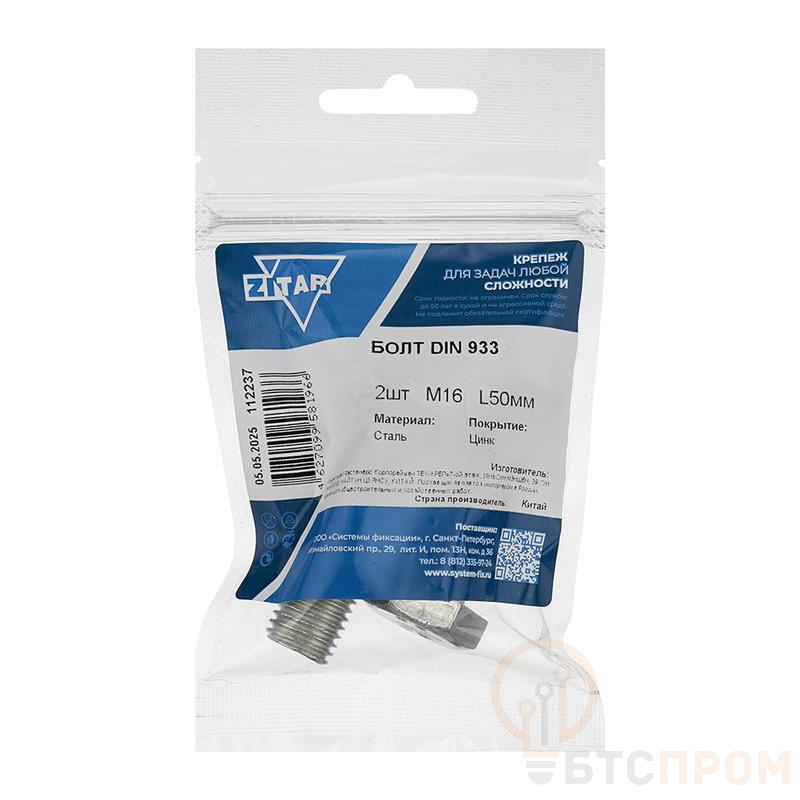 Болт с шестигранной головкой М16х50 DIN 933 оцинк. (уп.2шт) Tech-Krep/Zitar 112237 фото в каталоге от BTSprom.by