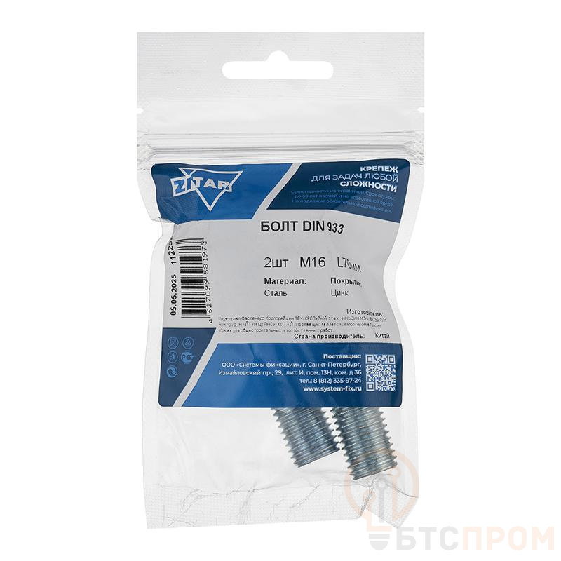 Болт с шестигранной головкой М16х70 DIN 933 оцинк. (уп.2шт) Tech-Krep/Zitar 112238 фото в каталоге от BTSprom.by