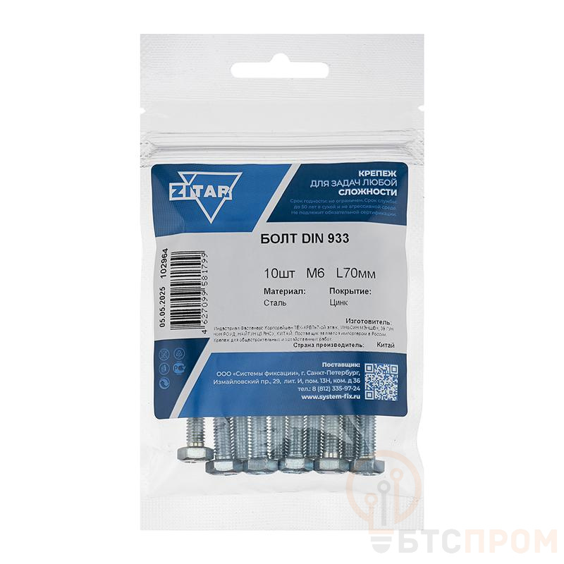 Болт с шестигранной головкой М6х70 DIN 933 оцинк. (уп.10шт) Tech-Krep/Zitar 102964 фото в каталоге от BTSprom.by
