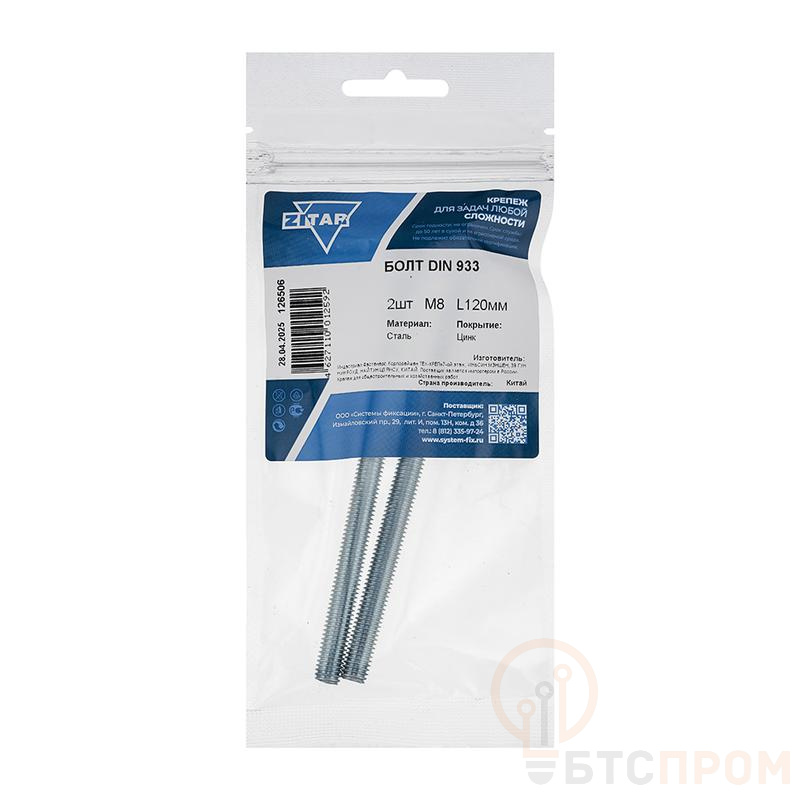 Болт с шестигранной головкой М8х120 DIN 933 оцинк. (уп.2шт) Tech-Krep/Zitar 126506 фото в каталоге от BTSprom.by