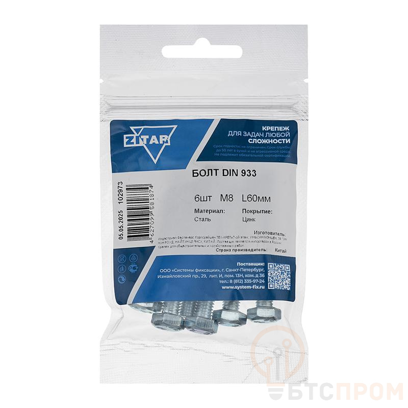 Болт с шестигранной головкой М8х60 DIN 933 оцинк. (уп.6шт) Tech-Krep/Zitar 102973 фото в каталоге от BTSprom.by