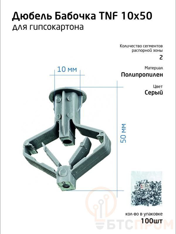Дюбель Бабочка TNF применяется для крепления конструкций небольшого веса (деревянные направляющие, полки, карнизы и пр.) к тонкостенным основаниям: гипсокартонным листам (ГКЛ), гипсоволокнистым листам (ГВЛ), древесно-стружечным плитам (ДСП), фанере и другим материалам. Изготовлен из полипропилена. Конструкция дюбеля обеспечивает надежную фиксацию в материале основания. Дюбель устанавливается в предварительно просверленное отверстие диаметром 8 или 10 мм. При затягивании шурупа лепестки дюбеля подтягиваются к задней поверхности основания и образуют упор.