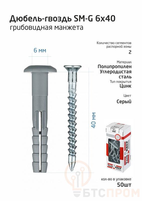 Дюбель-гвоздь SM-G состоит из следующих элементов: дюбель с грибовидным бортиком и двухсегментной распорной зоной, распорный элемент – специальный гвоздь с потайной головкой с крестообразным шлицем PZ и усиленным подголовником. Дюбель изготовлен из полипропилена, гвоздь – из углеродистой стали, покрытие – желтый цинк. Дюбель-гвоздь предназначен для крепления строительных материалов и изделий к основаниям из бетона, полнотелого кирпича, строительного камня. Применяется для сквозного монтажа кронштейнов, дверных коробок, оконных рам, кабельных каналов, обрешетки, гипсокартонных листов (ГКЛ), гипсоволокнистых листов (ГКЛ) и т.д. Для установки необходимо предварительно просверлить отверстие. Прочность крепежа достигается расклиниванием дюбеля в отверстии гвоздем в момент удара молотком. С помощью крестообразного шлица на головке гвоздя можно легко ослабить или усилить крепеж, демонтировать его.