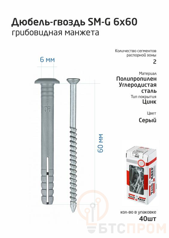Дюбель-гвоздь 6х60 с грибовидной манжетой полипропилен (уп.40шт) коробка Tech-Krep 112711 фото в каталоге от BTSprom.by