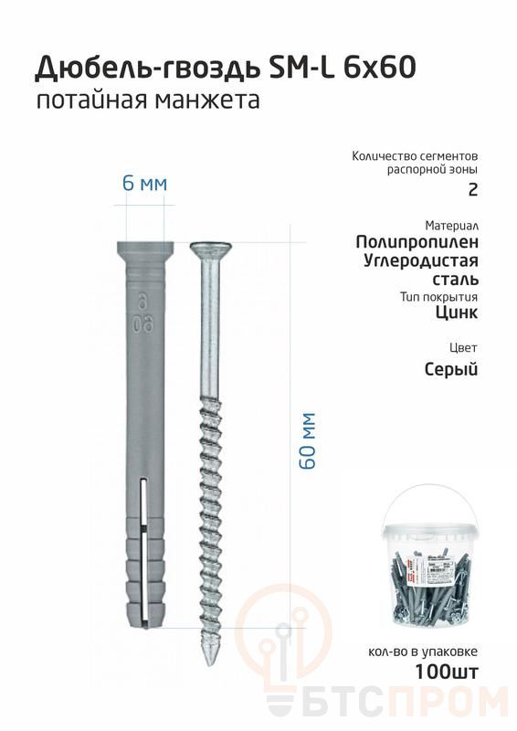 Дюбель-гвоздь SM-L состоит из следующих элементов: дюбель с потайным бортиком и двухсегментной распорной зоной, распорный элемент – специальный гвоздь с потайной головкой с крестообразным шлицем PZ и усиленным подголовником. Дюбель изготовлен из полипропилена, гвоздь – из углеродистой стали, покрытие – желтый цинк. Дюбель-гвоздь предназначен для крепления строительных материалов и изделий к основаниям из бетона, полнотелого кирпича, строительного камня. Применяется для сквозного монтажа кронштейнов, дверных коробок, оконных рам, кабельных каналов, обрешетки, гипсокартонных листов (ГКЛ), гипсоволокнистых листов (ГКЛ) и т.д. Для установки необходимо предварительно просверлить отверстие. Прочность крепежа достигается расклиниванием дюбеля в отверстии гвоздем в момент удара молотком. С помощью крестообразного шлица на головке гвоздя можно легко ослабить или усилить крепеж, демонтировать его. Дюбель-гвоздь с потайным бортиком устанавливается «заподлицо», т.е. его шляпка утапливается, благодаря чему возможно производить крепежные работы без последующего выравнивания поверхности.