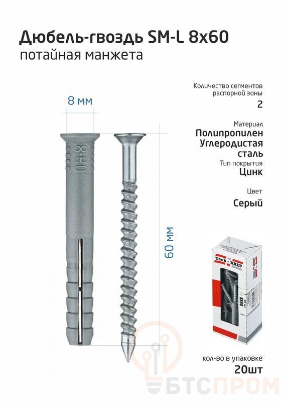 Дюбель-гвоздь SM-L состоит из следующих элементов: дюбель с потайным бортиком и двухсегментной распорной зоной, распорный элемент – специальный гвоздь с потайной головкой с крестообразным шлицем PZ и усиленным подголовником. Дюбель изготовлен из полипропилена, гвоздь – из углеродистой стали, покрытие – желтый цинк. Дюбель-гвоздь предназначен для крепления строительных материалов и изделий к основаниям из бетона, полнотелого кирпича, строительного камня. Применяется для сквозного монтажа кронштейнов, дверных коробок, оконных рам, кабельных каналов, обрешетки, гипсокартонных листов (ГКЛ), гипсоволокнистых листов (ГКЛ) и т.д. Для установки необходимо предварительно просверлить отверстие. Прочность крепежа достигается расклиниванием дюбеля в отверстии гвоздем в момент удара молотком. С помощью крестообразного шлица на головке гвоздя можно легко ослабить или усилить крепеж, демонтировать его. Дюбель-гвоздь с потайным бортиком устанавливается «заподлицо», т.е. его шляпка утапливается, благодаря чему возможно производить крепежные работы без последующего выравнивания поверхности.