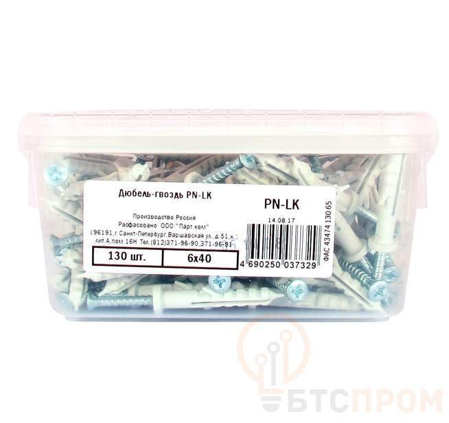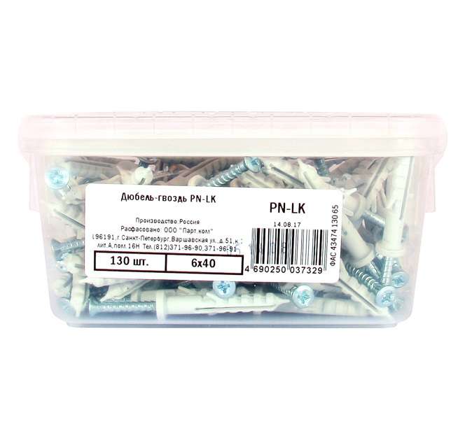 Дюбель-гвоздь PN-LK 6х40 контейнер нейлон (уп.130шт) Партнер ФАС4347413065 – набор крепежный. Включает дюбеля, изготовленные из нейлона, длиной 40 мм, с винтовыми гвоздями, в количестве 130 шт в наборе. Применяются при креплении гвоздей в отверстия диаметром 6 мм.