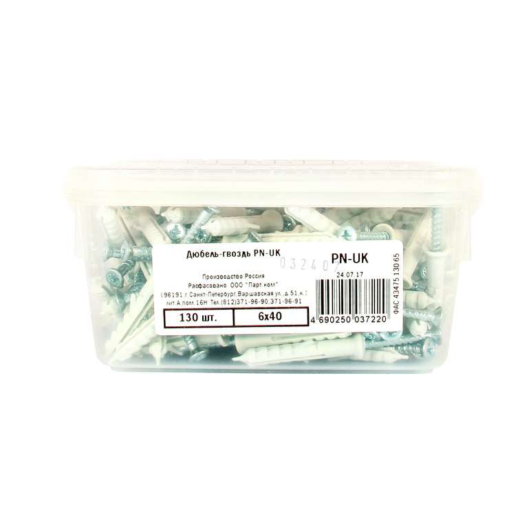 Дюбель-гвоздь PN-UK 6х40 контейнер нейлон (уп.130шт) Партнер ФАС4347513065 – набор крепежный. Включает дюбеля, изготовленные из нейлона, длиной 40 мм, с винтовыми гвоздями, в количестве 130 шт в наборе. Применяются при креплении гвоздей в отверстия диаметром 6 мм.