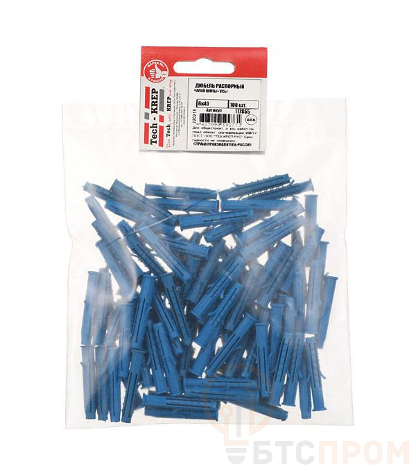 Дюбель распорный Чапай 6х40 шипы+усы полипропилен (уп.100шт) пакет Tech-Krep 117855 фото в каталоге от BTSprom.by