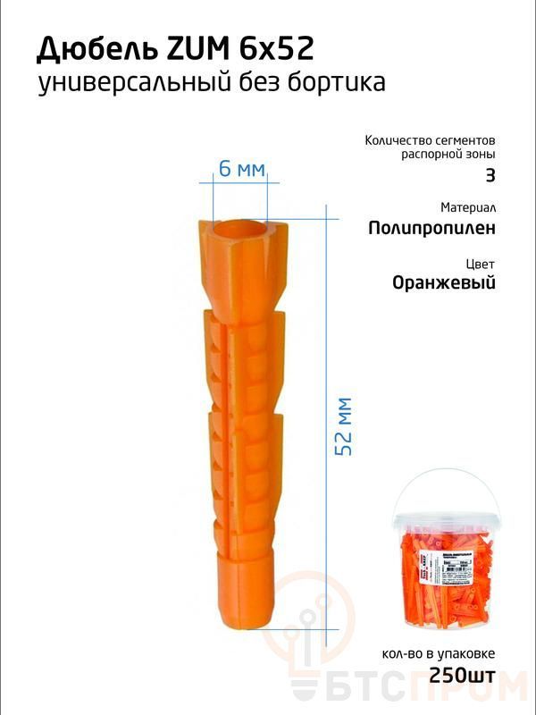 Дюбель универсальный ZUM может быть двух видов: с плоским цилиндрическим бортиком и 3-х сегментной распорной зоной; без бортика и с 3-х сегментной распорной зоной. Применяется для крепления различных деталей и изделий к следующим основаниям: бетон, полнотелый и пустотелый кирпич, газобетон, керамзитобетон, листовые материалы, камень. Изготовлен из полипропилена. В полнотелых материалах дюбель работает за счет распора, а в пустотелых и листовых материалах скручивается в плотный узел и фиксируется в виде «якоря» с внутренней стороны. Дюбель используется совместно с универсальными шурупами, сантехническими болтами, шпилькой-шурупом и т.д. Не рекомендуется применять его с черными саморезами. Устанавливается в предварительно просверленное отверстие.