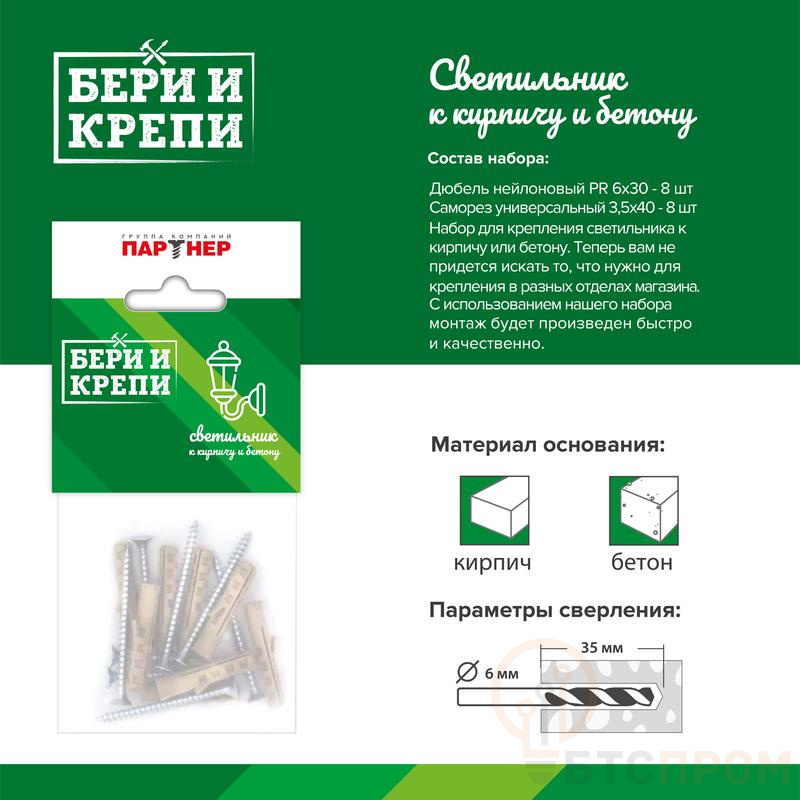 Набор для крепления светильника к кирпичу или бетону. Теперь вам не придется искать то, что нужно для крепления в разных отделах магазина. С использованием нашего набора монтаж будет произведен быстро и качественно. КОМПЛЕКТАЦИЯ Дюбель нейлоновый PR 6х30 - 8 шт Саморез универсальный 3,5x40 - 8 шт