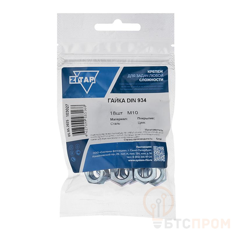 Гайка шестигранная М10 DIN 934 цинк. (пакет) (уп.18шт) Tech-Krep/Zitar 103027 фото в каталоге от BTSprom.by