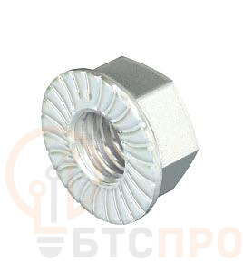 Ключевой особенностью данной гайки является интегрированная стопорная шайба с радиальными насечками. При затяжке зубцы шайбы врезаются в опорную поверхность и материал гайки, обеспечивая эффект стопорения и предотвращая самопроизвольное откручивание под воздействием вибраций и переменных нагрузок.