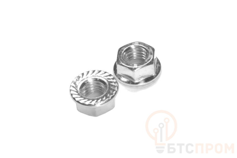 Ключевой особенностью данной гайки является наличие стопорного буртика (фланца) с насечкой (нейлоновым кольцом) на одной из сторон. Эта насечка создает повышенное сопротивление вращению, предотвращая самопроизвольное откручивание под воздействием вибраций и динамических нагрузок. Широкая опорная поверхность фланца увеличивает площадь контакта, распределяя давление и защищая скрепляемые материалы от повреждений.