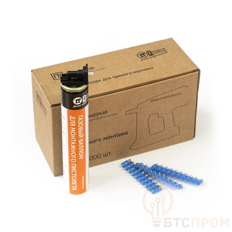 Комплект для прямого монтажа от Промрукав – это готовое решение для быстрого и надежного крепления материалов к бетону и стали. В набор входит газовый баллон калибра 165 мм и 1000 усиленных гвоздей размером 3x27 мм.