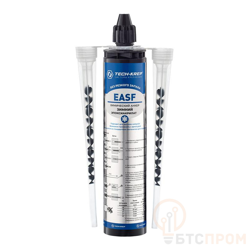 Химический анкер EASF EPOXY WINTER 300мл от Tech-KREP – это высокопрочная двухкомпонентная эпоксидная смола, предназначенная для надежного монтажа в условиях низких температур (до -15°C). Состав поставляется в удобном картридже для монтажного пистолета, что обеспечивает простоту и точность дозирования.