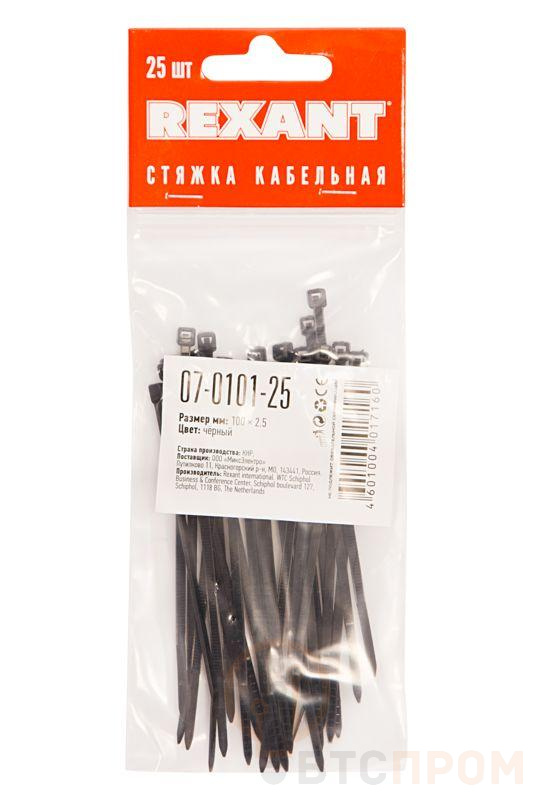 Нейлоновый хомут представляет собой экономичное и легкое крепежное изделие, используемое при проведении электромонтажных работ и организации кабельных систем. С его помощью выполняется фиксация проводов и труб, соединение их в жгут, маркировка и крепление к поверхностям. Стяжки изготовлены из высокопрочного нейлона- 6,6 (полиамида). Материал способен выдерживать большие нагрузки и не подвергается воздействию ультрафиолета, органических растворителей и горюче-смазочных материалов. Для монтажа устройства нужно вставить конец зубчатой ленты в замок и затянуть до образования петли необходимого диаметра. Также можно воспользоваться специальным монтажным инструментом (арт. 12-4524, 12-4521 и 12-4541). В упаковке поставляются 25 черных стяжек размером 100x2,5 мм.