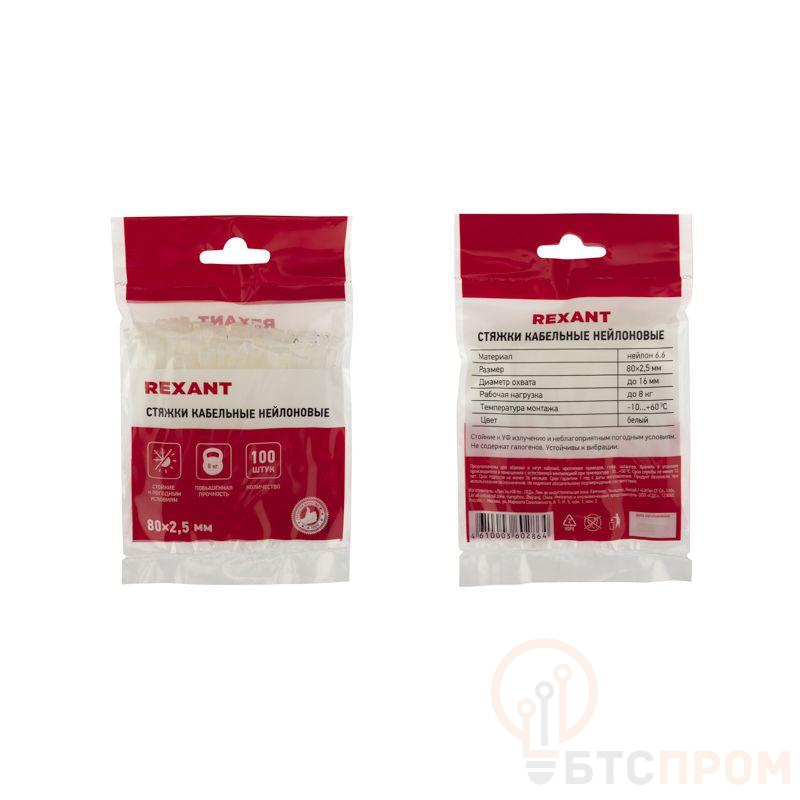 Нейлоновый хомут (кабельная стяжка) REXANT представляет собой белую гибкую полоску из полиамида с замковым механизмом одностороннего действия. Используется для крепления или соединения в жгут проводов, кабелей и любых разновидностей труб. Прочность, эластичность и простота монтажа позволяют использовать их на предприятиях и в быту. Нейлоновая стяжка REXANT отличается надежной фиксацией, прочностью и устойчивостью к внешним воздействиям. Изделие является экологически чистым продуктом, не содержит галогенов. Установка может быть выполнена вручную или с помощью специального пистолета. По окончании работ излишки длины обрезаются. Не рекомендуется перегибать изделие более чем на 90° при монтаже или хранении. В упаковке поставляются 100 стяжек размером 80x2,5 мм.