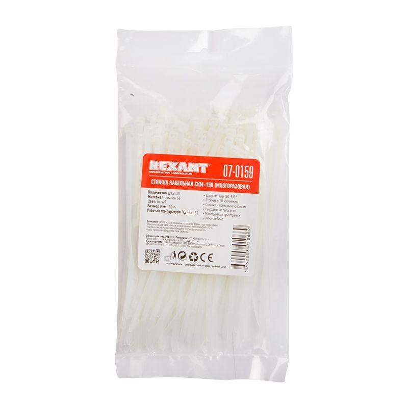 Хомут нейлоновый многоразовый REXANT 150x3,5 мм белого цвета предназначен для крепления или обвязки в жгут кабелей и проводов, гибких гофротруб, а также закрепления других объектов на несущей поверхности. Стяжка используется при проведении электромонтажных работ, при монтаже структурированных кабельных систем, а также для бытовых нужд. Стяжка представляет собой гибкую полоску из нейлона высокой прочности (нейлон 6,6) с замком на конце. Изделие отличается уникальной конструкцией замка, предполагающей многоразовое использование. В устройстве замка предусмотрен специальный язычок, нажатие на который освобождает ленту из паза, в результате чего стяжка может быть использована повторно. Это позволит сэкономить на приобретении новых хомутов и выполнить работу более аккуратно. Простой и удобный монтаж осуществляется вручную либо с помощью специального инструмента. Не рекомендуется перегибать бандаж при затяжке. Нейлоновые стяжки гарантируют качество, оперативность и экономичность профессионального электромонтажа, обеспечив максимально надежную фиксацию предметов.