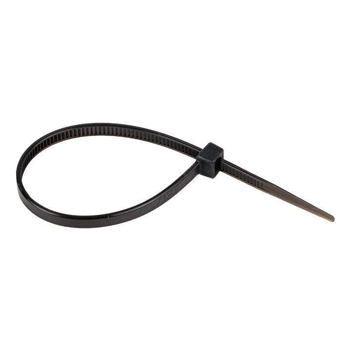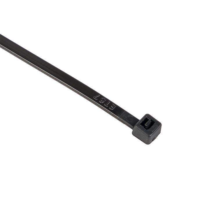 Предназначен для увязки кабелей и проводов в пучок и монтажа кабельных линий и проводников. Ремешок самофиксирующийся, блокирующий механизм. Изготовлен из Nylon 6.6, устойчивого к старению, коррозии, воздействию солей, ультрафиолета, кислот, щелочей, спирта, бензина и масел. При производстве кабельных стяжек черного цвета добавляется угольный порошок, который является одним из наиболее эффективных стабилизаторов. Он улучшает физические свойства продукции в стойкости к погодным условиям и УФ-излучению (прямые солнечные лучи).