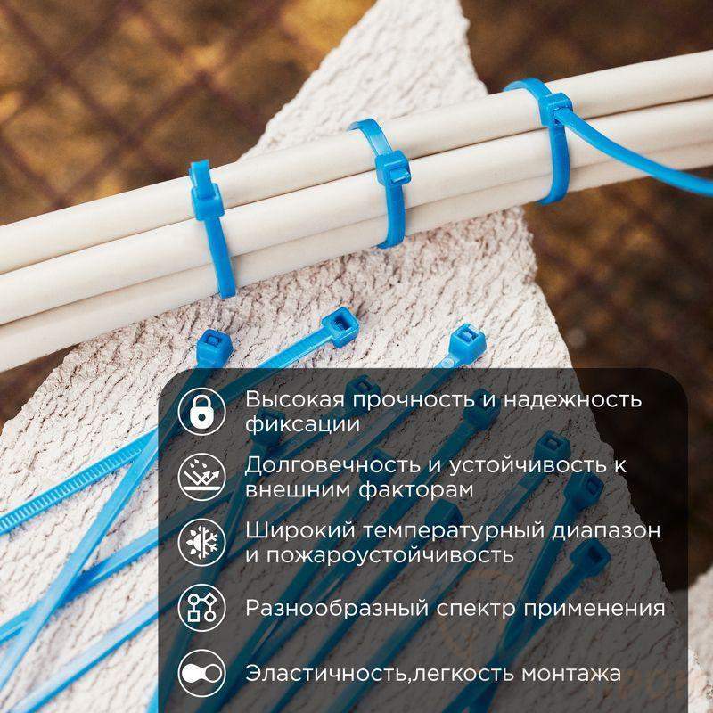 Хомут нейлоновый (кабельная стяжка) 200х3,6 мм синий REXANT предназначен для крепления или обвязки в жгут кабелей и проводов, крепления гибких гофротруб, а также других предметов к несущей поверхности или для соединения между собой. Такая стяжка используется при проведении электромонтажных работ, при монтаже структурированных кабельных систем, для бытовых нужд, а также в других отраслях народного хозяйства. Представляет собой гибкую полоску из нейлона высокой прочности (полиамид-6,6) с замком на конце. Полиамид-6,6 — кристаллизующийся конструкционный материал, имеющий высокую твердость и механическую прочность, отличающийся высокими электроизоляционными свойствами. Простой и удобный монтаж осуществляется вручную следующим образом: большим пальцем левой руки прижать замок к пучку, а правой рукой затягивайте петлю, либо с помощью специального инструмента REXANT арт.12-4521 или 12-4541 (вставить конец затяжки в замок и затянуть до полной фиксации пучка, после чего отрезать выступающую часть бандажа). Не рекомендуется перегибать бандаж при затяжке. Хомуты нейлоновые гарантируют качество, оперативность и экономичность профессионального электромонтажа, обеспечив максимально надежную фиксацию предметов. Основные характеристики: - длина и ширина: 200х3,6 мм - диаметр охвата (максимальный): 53 мм - максимальная рабочая нагрузка: 18 кг - прочность при растяжении: не менее 50 МПа - модуль упругости при растяжении: 8000-11000 МПа - высокое сопротивление к основаниям, маслам, смазочным материалам, хлоридным растворителям - класс воспламеняемости: UL 94 класс V-2 (самозатухающий) - не содержит галогенов - тип: неразъемные, одноразового использования - температурный диапазон использования: –35...+85 ? - количество в упаковке: 25 шт. - цвет: синий.