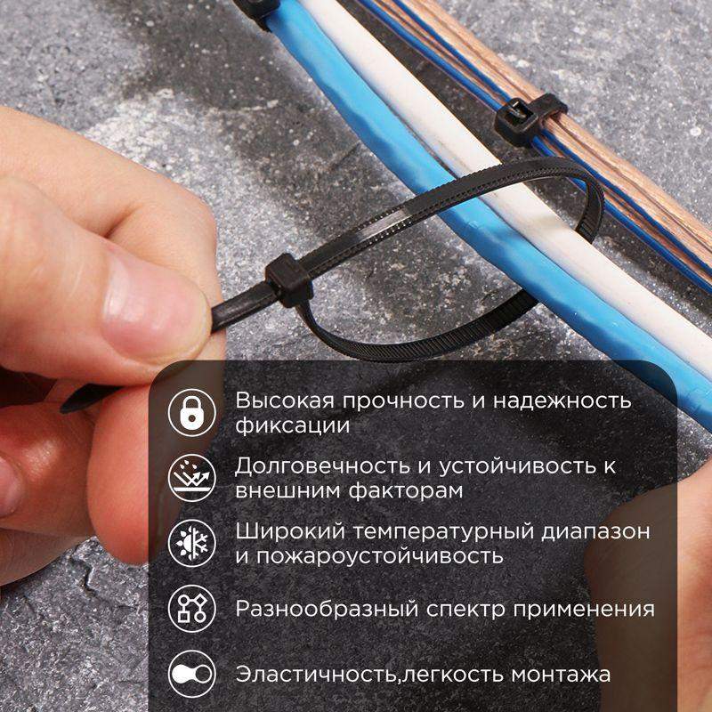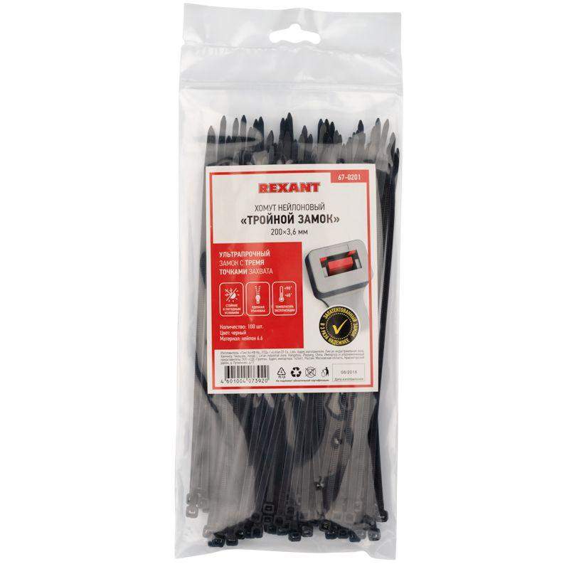 Нейлоновая хомут-стяжка Профессиональная с тройным замком – это высококачественное крепежное изделие, предназначенное для фиксации проводов, кабелей и труб в нужном положении, а также организации кабельных систем. Представляет собой черную нейлоновую полоску с высоким уровнем гибкости размером 200x3,6 мм. Стяжка изготовлена из нейлона-6,6, износостойкого и прочного материала. Данный вид хомутов на 30% крепче своих аналогов, так как оснащен двусторонним полотном с зубчиками и уникальным замком с тремя точками контакта. Изделия упакованы в герметичные пакеты многоразового использования с замком Zip-Lock. Этот тип упаковки обеспечивает удобное хранение и защиту от пыли, а также предотвращает потерю влаги. Стяжки упакованы в наборы по 100 штук. Установка хомутов может выполняться вручную или с помощью специального монтажного пистолета (арт. 12-4524, 12-4521 и 12-4541).