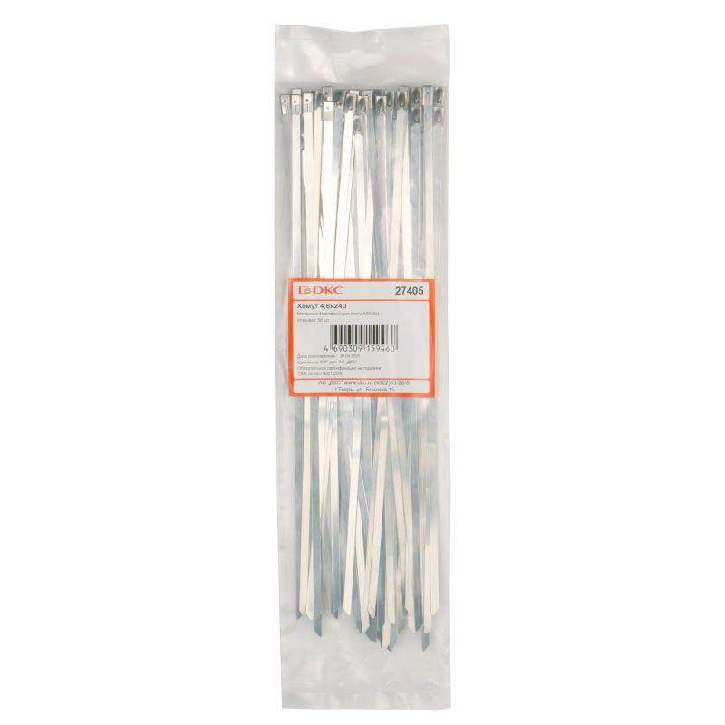 Кабельные хомуты из нержавеющей стали предназначены для монтажа трасс в условиях широкого диапазона температур, а также в условиях экстремально больших перепадов температур, химически агрессивных сред и больших нагрузок на разрыв. Материал полосы и замка – нержавеющая сталь AISI 304. Сталь AISI 304 имеет высокие показатели устойчивости коррозии в агрессивных средах, высокое сопротивление окислению и отличные низкотемпературные свойства. Температура эксплуатации от -80 до +538 °С. Предельная нагрузка – от 91 до 235 кг (ширина 12 мм) на замкнутое кольцо. Кромки ленты обработаны таким образом, чтобы не травмировать при монтаже. Замок - одиночный. Размеры: ширина - 4.6 мм, длина - 240 мм.