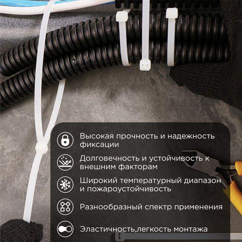 Нейлоновый хомут (кабельная стяжка) REXANT представляет собой белую гибкую полоску из полиамида с замковым механизмом одностороннего действия. Используется для крепления или соединения в жгут проводов, кабелей и любых разновидностей труб. Прочность, эластичность и простота монтажа позволяют использовать их на предприятиях и в быту. Нейлоновая стяжка REXANT отличается надежной фиксацией, прочностью и устойчивостью к внешним воздействиям. Изделие является экологически чистым продуктом, не содержит галогенов. Установка может быть выполнена вручную или с помощью специального пистолета. По окончании работ излишки длины обрезаются. Не рекомендуется перегибать изделие более чем на 90° при монтаже или хранении. В упаковке поставляются 100 стяжек размером 500x4,8 мм.