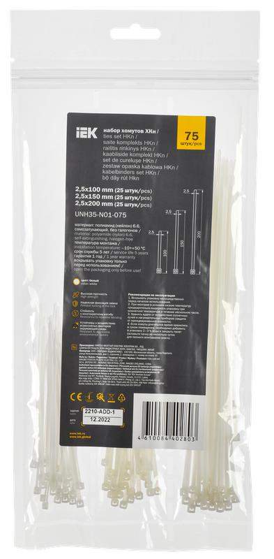 Набор хомутов 2.5х100; 2.5х150; 2.5х200 бел. (уп.75шт) IEK UNH35-N01-075