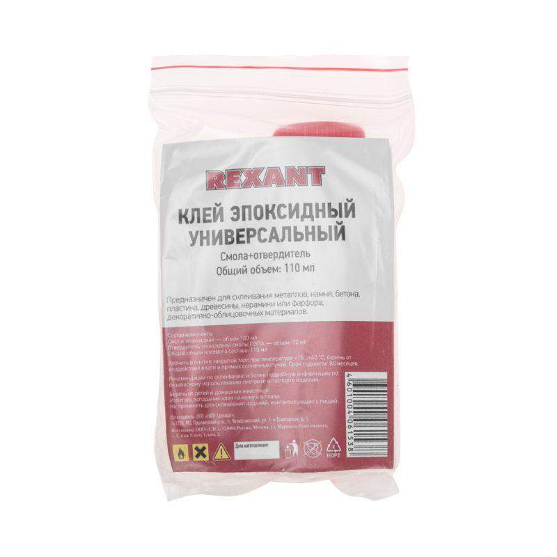 Клей эпоксидный универсальный (смола+отвердитель) 110 мл REXANT предназначен для склеивания металлов, камня, бетона, пластика, древесины, керамики или фарфора, а также для выравнивания поверхностей или избавления от трещин. В набор входит: Клей эпоксидный универсальный ЭДП-100 мл Отвердитель эпоксидной смолы ПЭПА-10 мл Способ применения: Склеиваемые поверхности необходимо обезжирить и просушить. Непосредственно перед использованием тщательно замешать клеевой состав в нужной пропорции (100 частей смолы к 10 частям отвердителя). Для полного отверждения при температуре 20...25 ?С требуется 24 часа, после чего можно пользоваться изделием. Клеевое соединение обладает повышенной устойчивостью к нагрузкам, воздействию атмосферных явлений и старению.