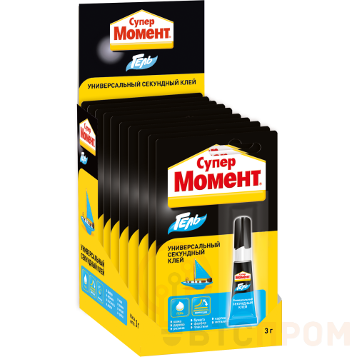 Супер Момент Гель отлично склеивает широкий спектр материалов. Это быстрый, надежный и стойкий гелеобразный секундный клей, который не подведет! Секундный клей гелевой консистенции идеален для применения на вертикальных поверхностях — не растекается, не капает. <ul> <li>Идеален для вертикальных поверхностей</li> <li>Не растекается, не капает</li> <li>Возможность коррекции при склеивании</li> </ul>